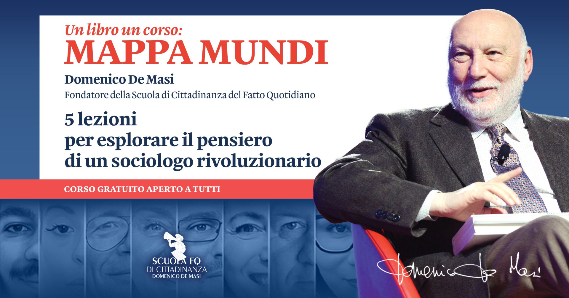 La Scuola di Cittadinanza del Fatto Quotidiano ha tra i suoi fondatori una mente d’eccezione, il sociologo Domenico De Masi, che ha contribuito a idearla e l’ha costruita con profondità e originalità per trasformare la “solitudine intellettuale del cittadino” di fronte a una realtà contemporanea sempre più complessa, in coscienza civica e cittadinanza attiva. Per approfondire la conoscenza del pensiero di questo straordinario sociologo, la Scuola propone un ciclo di corsi online dedicati allo studio dei suoi libri più illuminanti. Saranno incontri gratuiti aperti a tutti e trasmessi in diretta streaming sulla homepage del sito scuoladelfatto.it dove sarà anche possibile rivederli nella sezione Eventi.